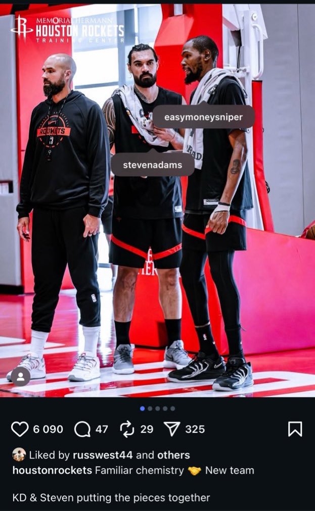 重回火箭?火箭官方晒亚当斯杜兰特合照 威少点赞!