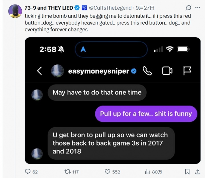 @CuffsTheLegend曝光了该条私信,并配文道:“定时炸弹,他们求着我引爆它...如果我按下这个红色按钮...每个人要上天堂...按下这个红色按钮...一切都永远改变了。”