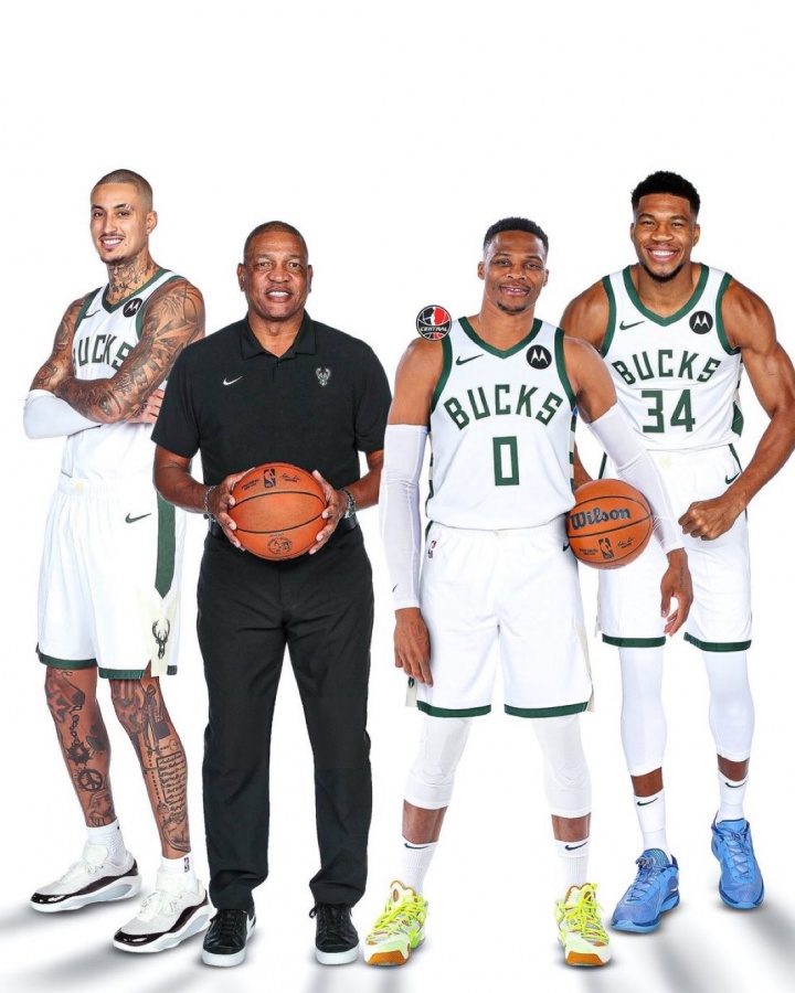 10月05日讯 雄鹿媒体SleeperBucks更新社媒动态,晒出一张字母哥、老里弗斯、库兹马和威少的合成图,并写道:“我鹿是否应该考虑引进拉塞尔-威斯布鲁克?”