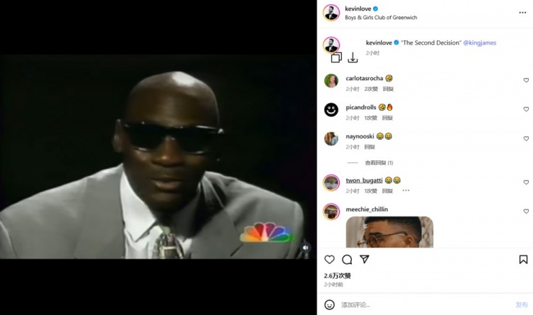 詹姆斯的好基友凯文-乐福更新IG晒出乔丹的演讲视频,并打趣詹姆斯:“决定二”。