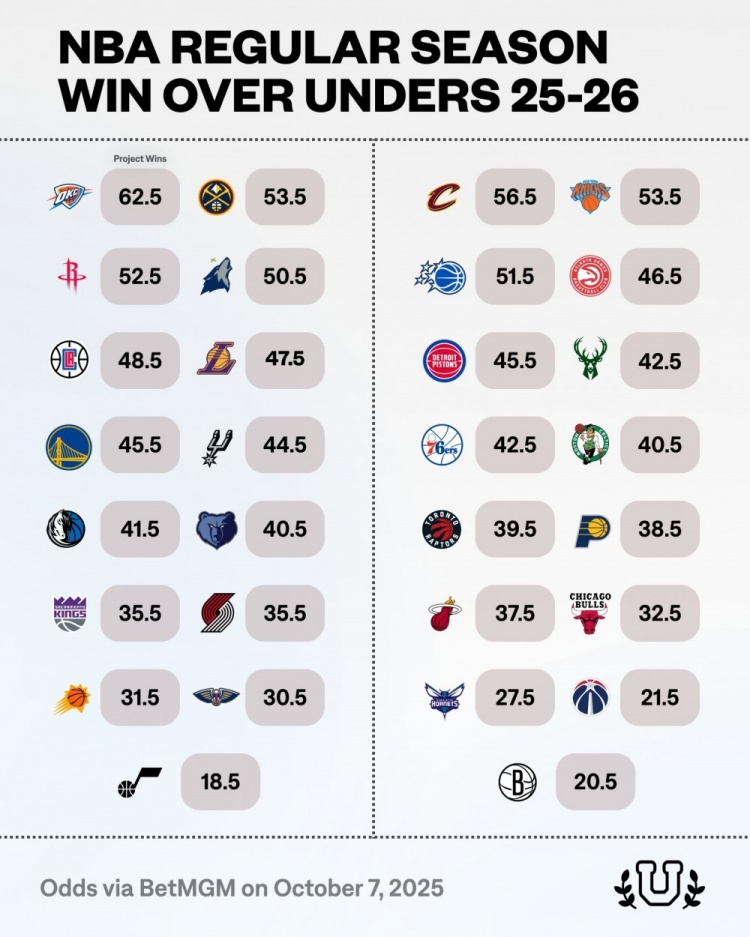 博彩公司为各队开出的新赛季胜场数指数 雷霆依旧被视为联盟第一