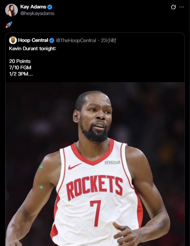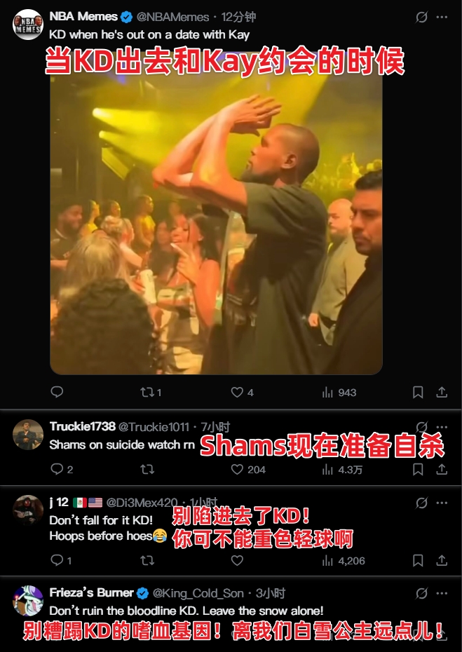 杜兰特近年来频繁做客Kay Adams的播客节目,并且KD也曾发出了与其在火箭赛后一起吃烧烤的邀请。值得一提的是,ESPN名记Shams Charania曾被Kay Adams发了好人卡,Kay称Shams是自己的男闺蜜。