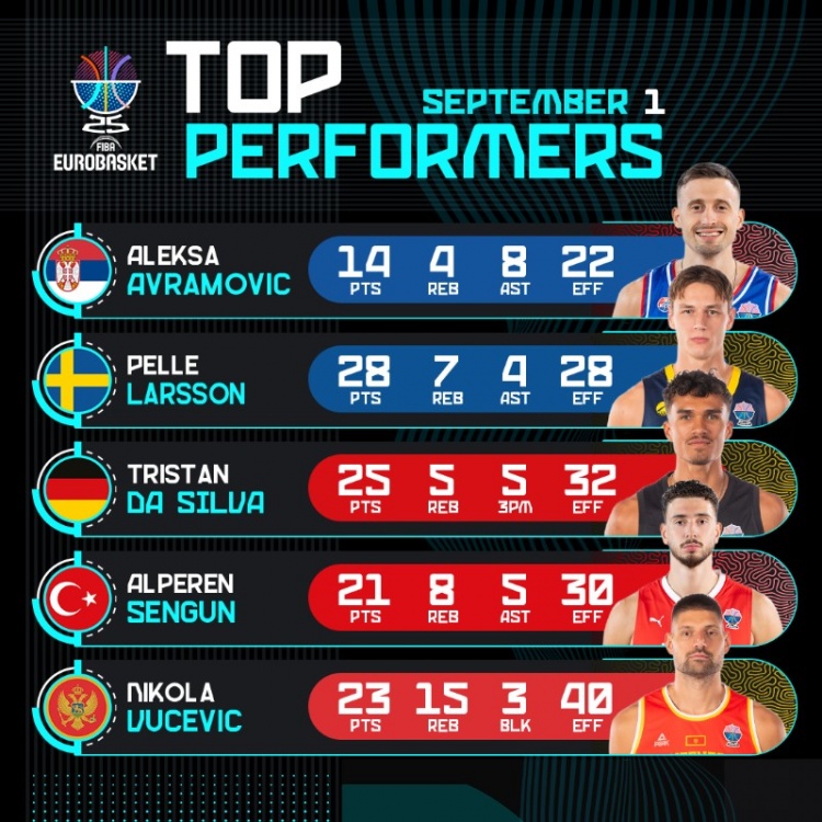 9月2日讯 男篮欧锦赛结束了又一个比赛日的争夺,今天,欧锦赛官推晒出了昨日的球员高光表现。