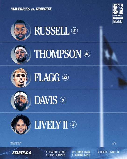 赛前独行侠官方公布了本场比赛首发阵容:拉塞尔、克莱、戴维斯、弗拉格、莱夫利。