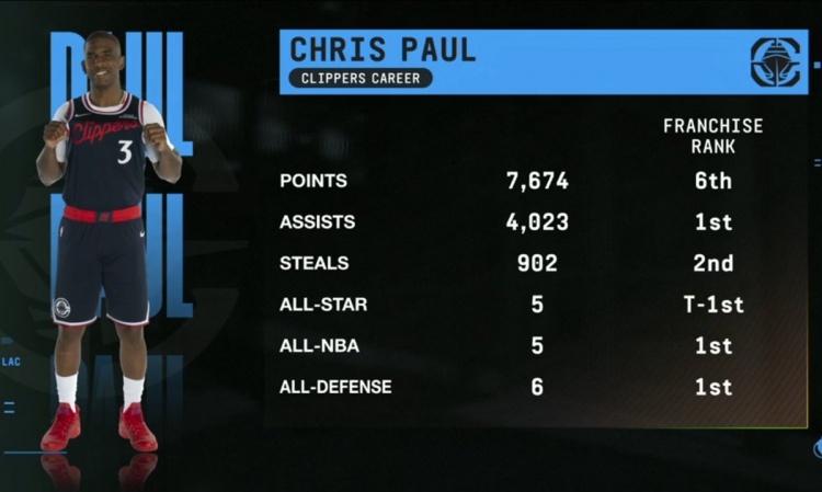 在快船效力期间,保罗共得到7674分(队史第6),送出4023次助攻(队史第1),完成902次抢断(队史第2),5次入选全明星(并列队史第1),5次入选最佳阵容(队史第1),6次入选最佳防守阵容(队史...