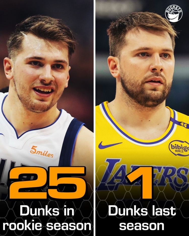 美媒晒图统计,东契奇新秀赛季扣篮25次,上赛季仅1次。