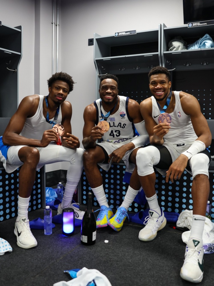 赛后,字母哥晒出三兄弟在更衣室的合照,照片中三人都在展示这枚欧锦赛铜牌。