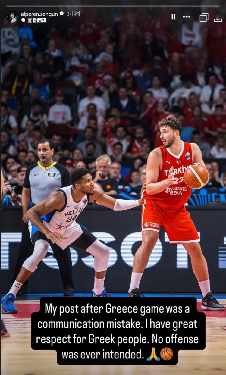 他在社媒中写道:“我在对阵希腊的比赛后发布的动态是一次沟通上的错误。我非常尊重希腊人民,从未有冒犯之意。🙏🏀”