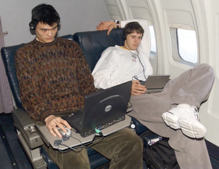 美媒写道:2002年,姚明在球队飞机上玩《过山车大亨》,而波斯简-纳赫巴在一旁看电影。