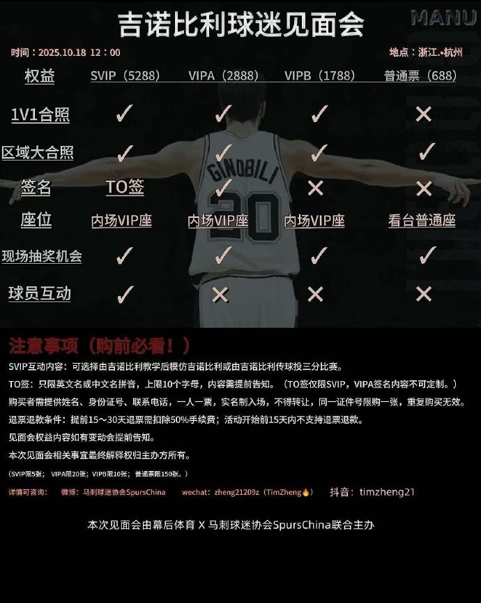 9月19日讯 马刺名宿马努-吉诺比利将在下月开展中国行活动。吉诺比利在杭州的球迷见面会,SVIP票价为5288元,VIPA为2888元,VIPB为1788元,普通票为688元。...