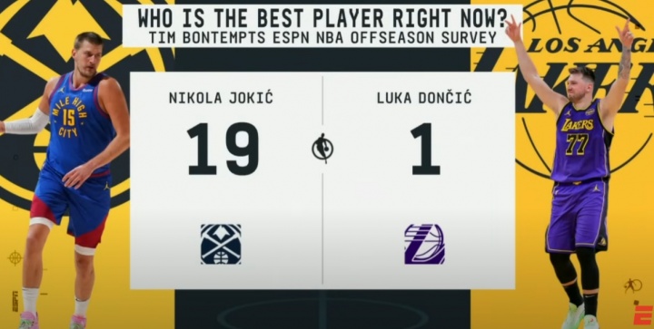 在被问到谁是NBA现在最好的球员这个问题时,20名投票者给出了惊人一致的答案:19票约基奇,1票东契奇,再无其他人入选,包括上赛季的MVP、FMVP、得分王亚历山大。