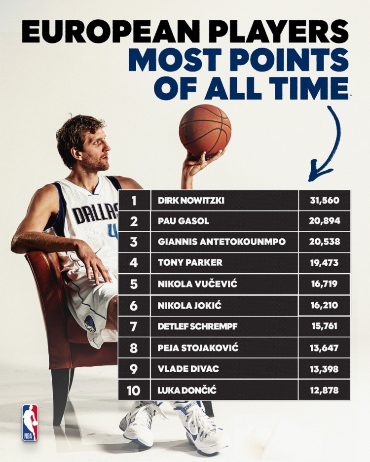 官方晒欧洲球员得分前十:司机领跑 字母哥将超大加 东契奇第10