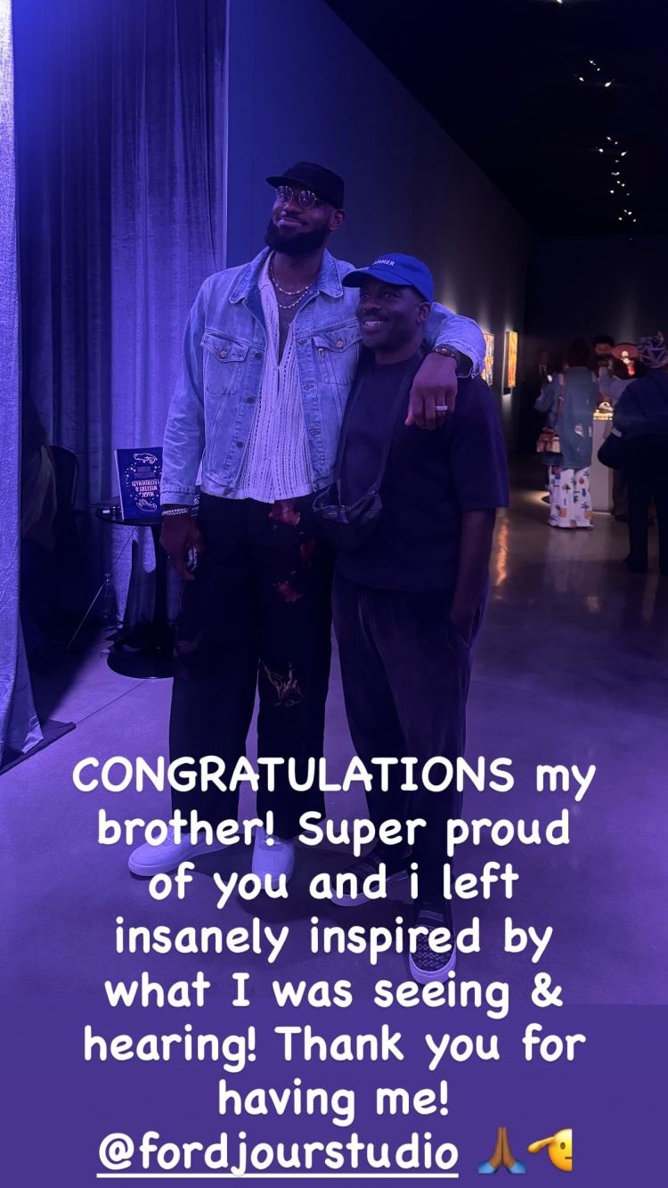 詹姆斯晒出了他和绘画艺术家Derek Fordjour在后者画展上的合影,并写道:“恭喜我的兄弟!我为你感到无比骄傲,我看到和听到的一切让我深受启发!感谢你的邀请!🙏🏾🫡”