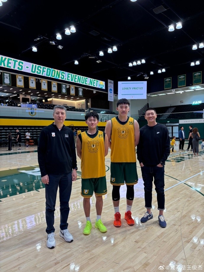 王俊杰晒出中国男篮主教练郭士强和助教李昂来到旧金山大学照片,两人观看了王俊杰和赵维伦的训练。