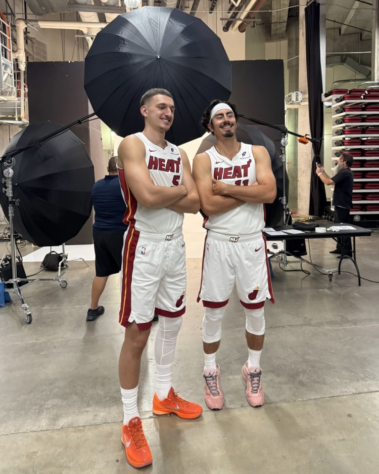 9月30日讯 热火官方社媒晒出了媒体日上约维奇和哈克斯的合影。从照片中可以看到,哈克斯一直踮着脚,想要减少和约维奇的身高劣势。