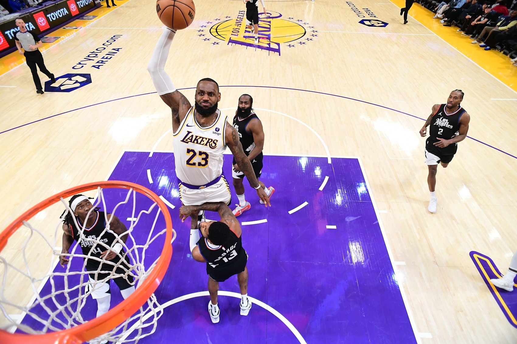 詹姆斯为这记隔扣打出100分,并表示:“这可是打快船啊。你们也都懂得在这里我们对快船是什么看法,因此,这个分数和PG(乔治)无关,PG是个好人,他当然做了一个商业决定,让开了路线。但我打这个分数真的是因为这是对阵快船时扣的。”