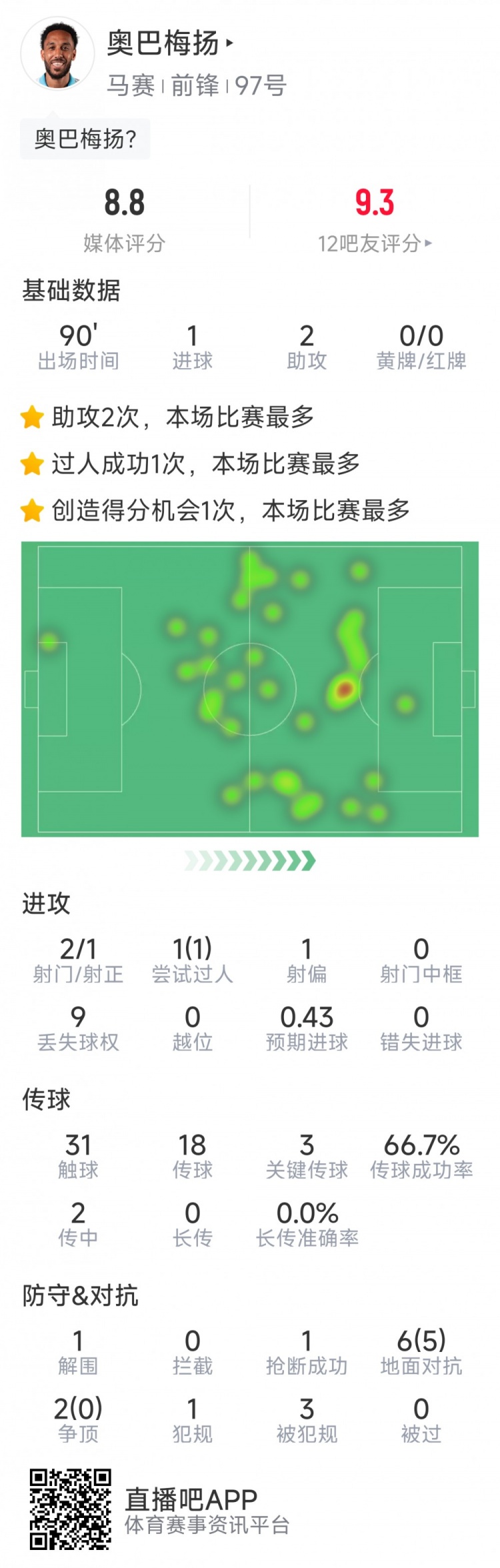 10月1日讯 在本轮欧冠,马赛4-0大胜阿贾克斯。本场比赛奥巴梅扬1球2助攻,以下为他在本场数据: