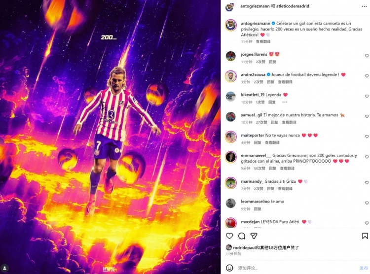 格列兹曼社媒纪念马竞生涯200球:身披这身球衣庆祝是一种荣幸