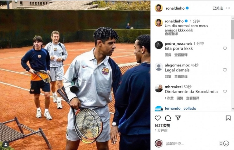 罗纳尔迪尼奥社媒晒出效力巴萨时期与里杰卡尔德、梅西、罗卡(助教)一起打网球的照片,配文:“与朋友们度过的平常一天,哈哈哈。”