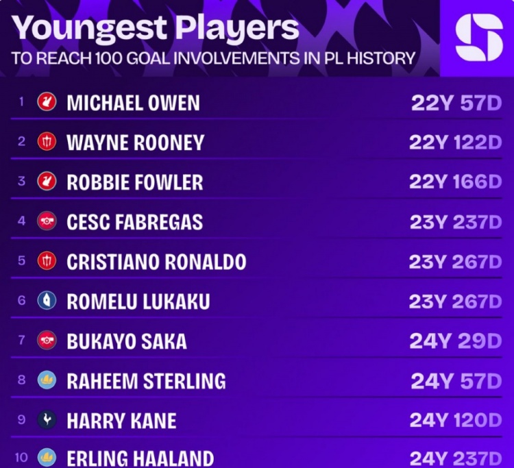 英超参与100球最年轻球员榜:欧文22岁57天居首,C罗第5、萨卡第7