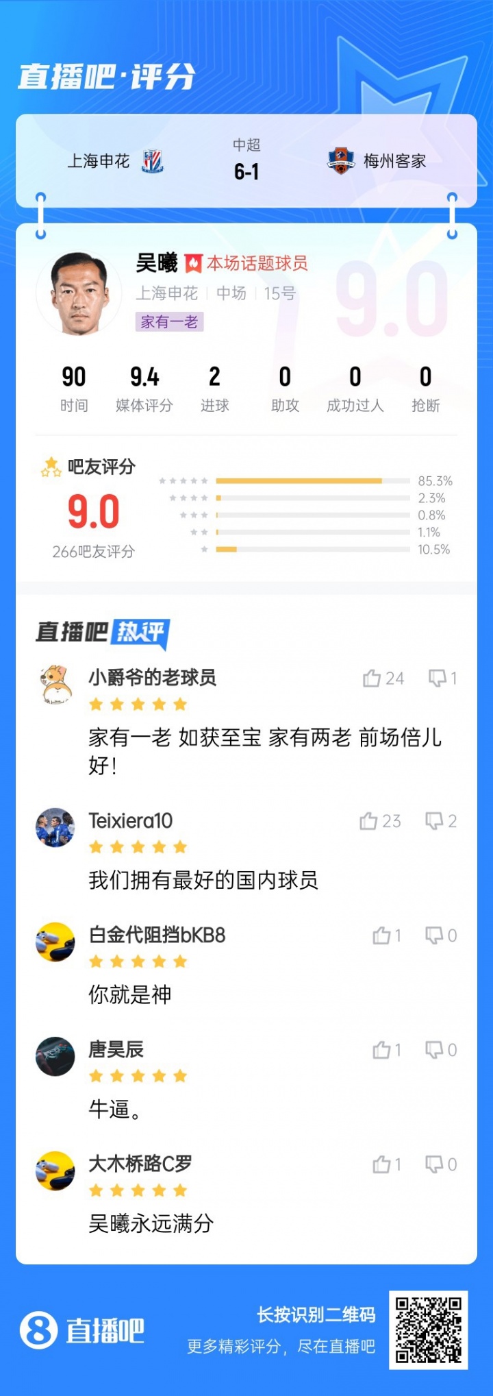 【】中超第26轮最佳球员评选结果出炉,上海申花队长吴曦当选!36岁的吴曦梅开二度,率领申花主场6-1击败梅州客家,保持对中超冠军的冲击,这是吴曦本赛季第二次赢得中超最佳评选!【】中超第26轮最佳球员评...