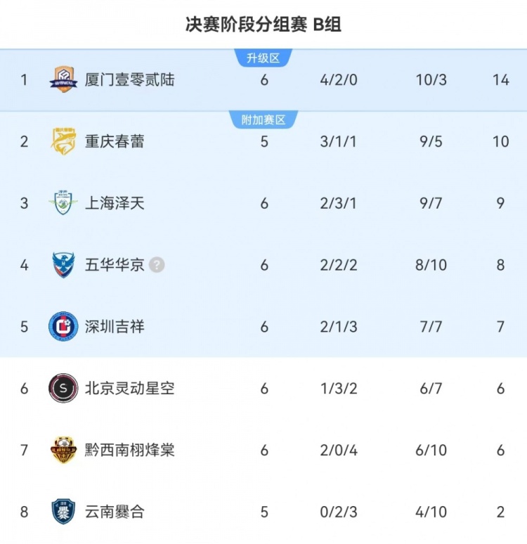 积分榜上,门壹零贰陆以6战4胜2平积14分,排名B组榜首。10月6日晚上,竞争对手重庆春蕾本轮比赛将在主场对阵云南爨合,如重庆队本场比赛不能取胜,厦门队将凭借对重庆队的胜负关系优势,提前一轮锁定小组第一,获得晋级2026中乙联赛的资格!