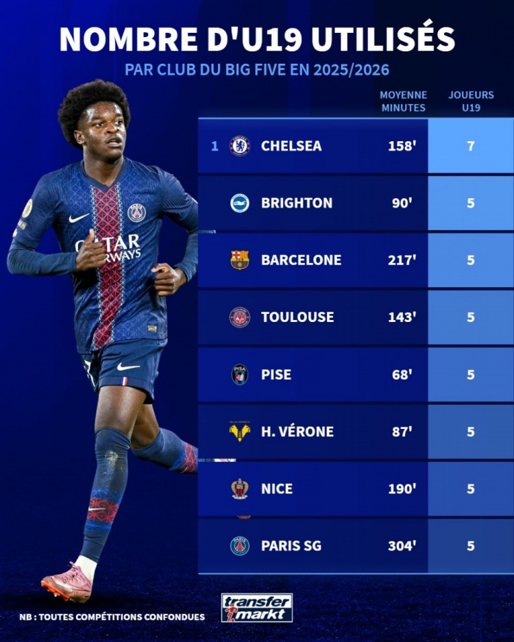 本赛季五大联赛使用U19球员数量:切尔西7人最多,巴萨、巴黎5人