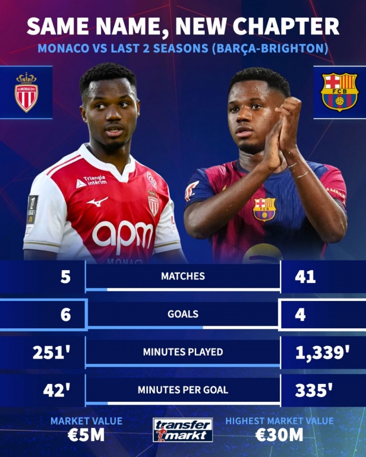 10月7日讯 法蒂今夏从巴萨租借加盟摩纳哥,德国转会市场统计了法蒂过去两个赛季在巴萨、布莱顿的数据,以及本赛季在摩纳哥的数据,做出对比。