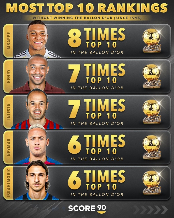 10月07日讯 据外媒score90统计,姆巴佩8次入围金球奖前十,但从未获奖,历史最多。