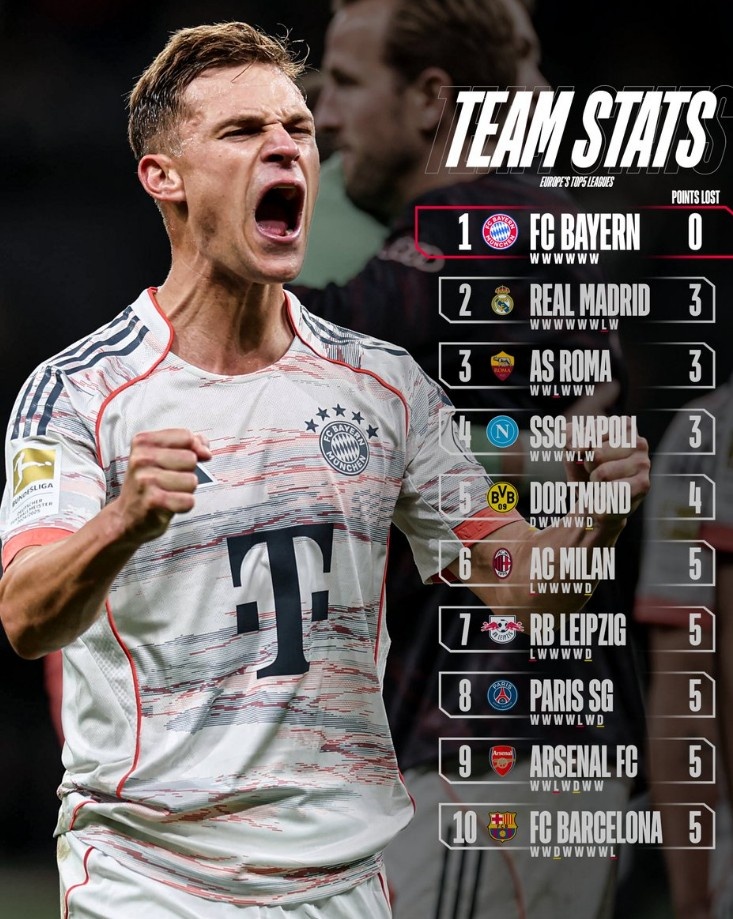10月7日讯 拜仁官推晒出本赛季五大联赛球队最少失分榜,其中拜仁是唯一全胜球队,皇马等三队失3分。以下为具体榜单: