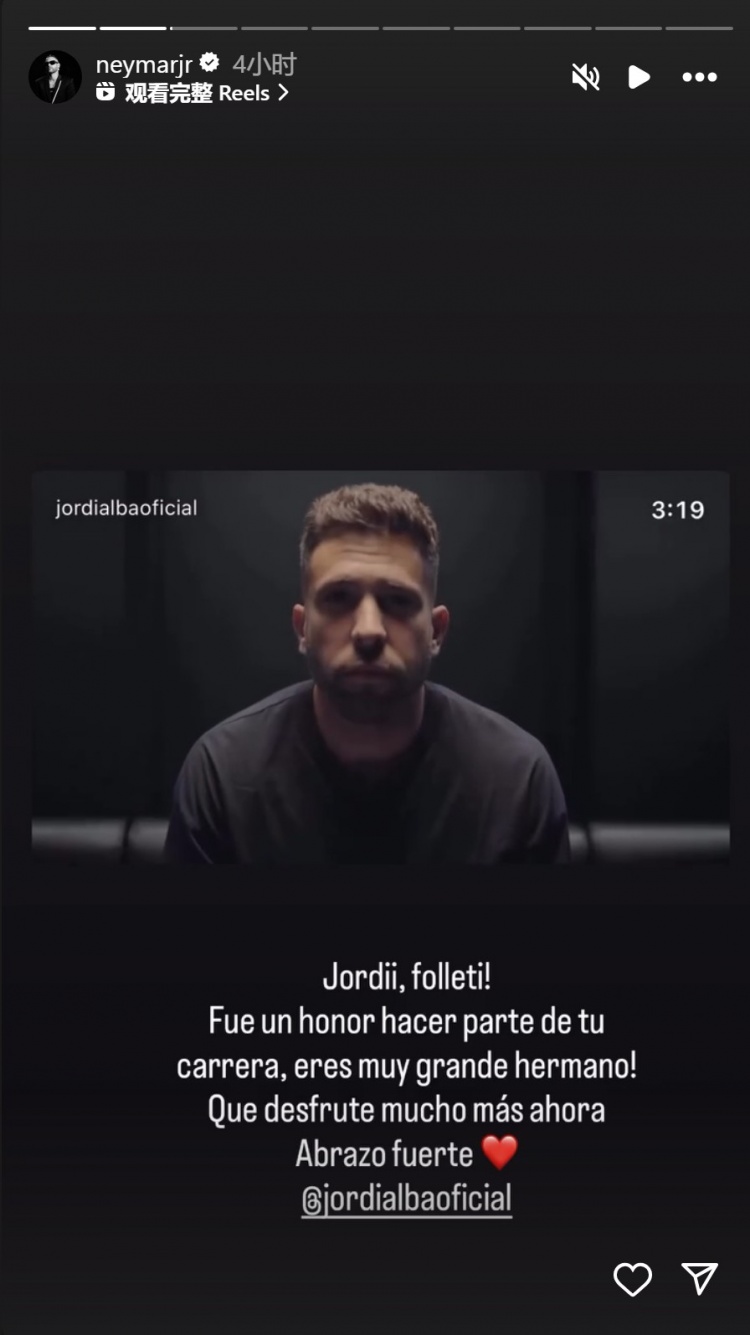 内马尔社媒致敬阿尔巴:很荣幸成为你职业生...
