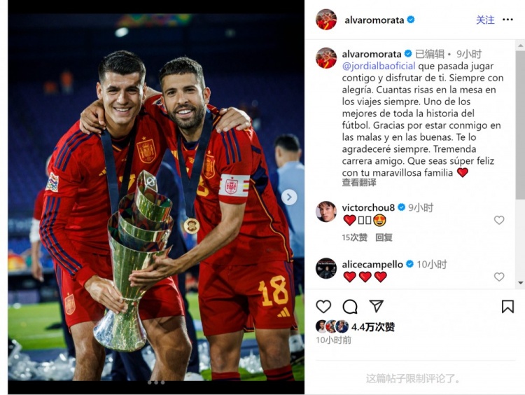 莫拉塔社媒晒出与阿尔巴在西班牙队的合照,并写道:“与你并肩作战、共享欢乐的时光何其珍贵,你总是充满快乐,旅途餐桌上欢声笑语不断。你是足球历史上最杰出的球员之一。”