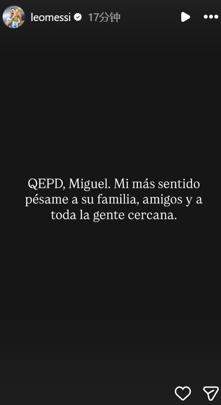 在社交媒体上,阿根廷巨星梅西表达了哀悼之情,他写道:安息吧,米格尔!我要向他的家人、朋友以及所有亲近的人致以最深切的哀悼!