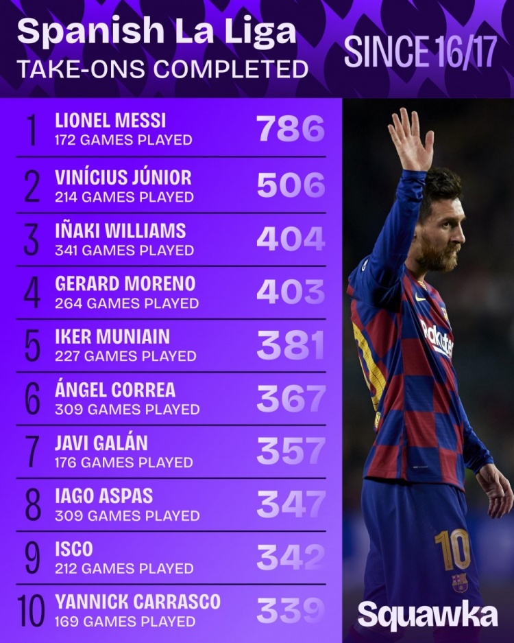 16-17赛季以来西甲过人榜:梅西786次居首,维尼修斯506次第二