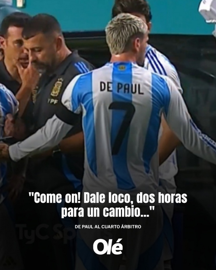 德保罗此役为阿根廷队替补出场,据《奥莱报》报道,德保罗对第四官员抱怨换人太慢,他说道:“快点!哥们,换个人要等俩小时。”