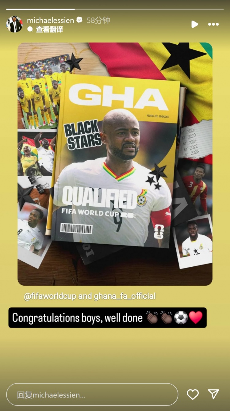 加纳足坛名宿埃辛社媒转发海报,祝贺加纳进军世界杯,配文:“恭喜小伙子们,干得好!”