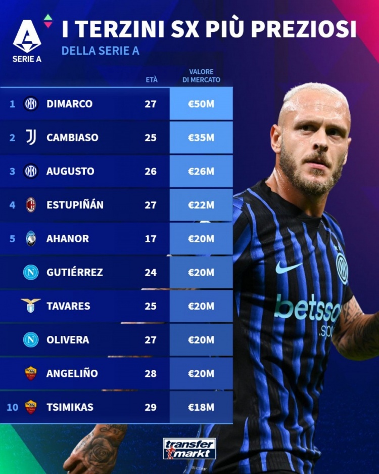 德转盘点意甲左后卫身价排名:迪马尔科5000万欧居首