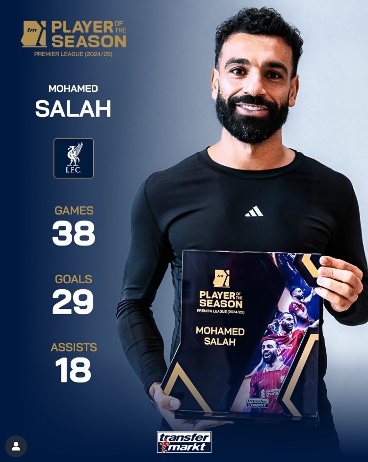 29球18助,萨拉赫领取德转颁发的上赛季...