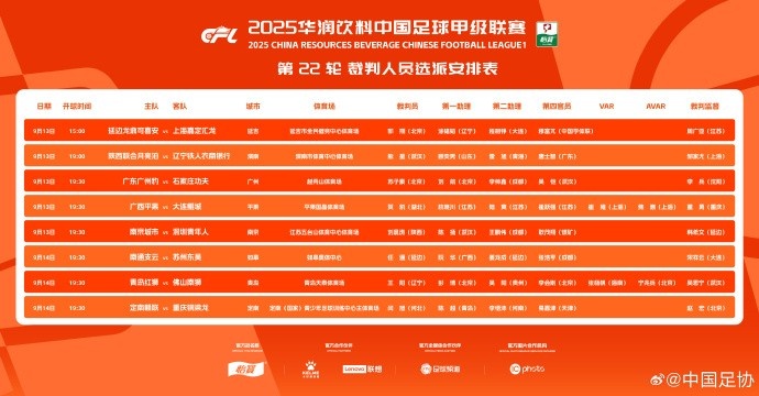 9月13日讯 中国足协官方公布中甲第22轮裁判人员安排,其中广西平果vs大连鲲城和青岛红狮vs佛山南狮两场比赛安排有VAR裁判。