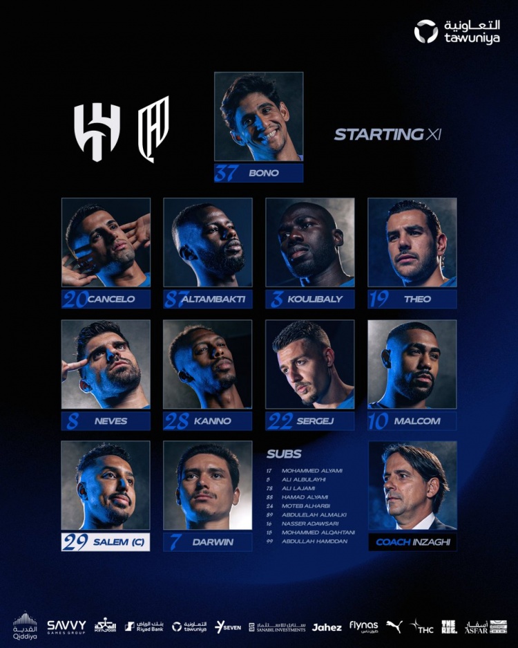 新月首发:37-布努、20-坎塞洛、87-坦巴蒂、3-库利巴利、19-特奥、8-鲁本-内维斯、28-卡努、22-米林科维奇、10-马尔科姆、29-萨利姆-多萨里、7-努涅斯