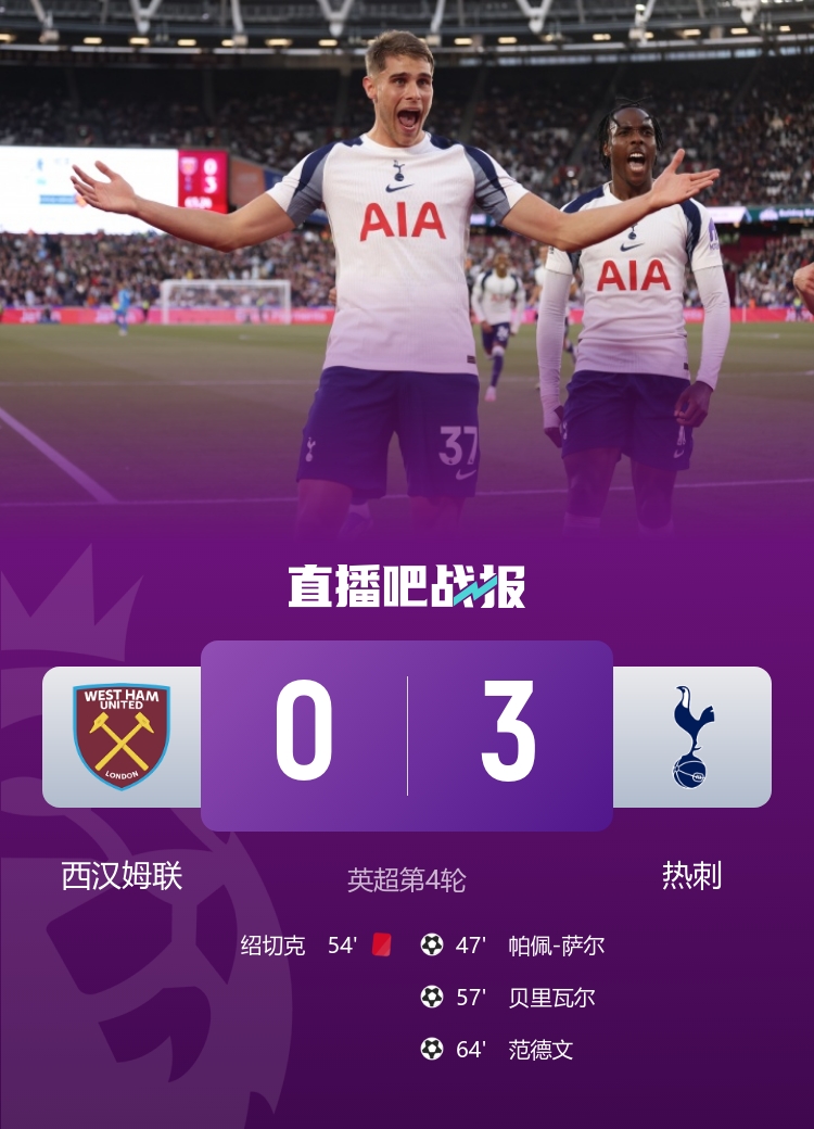 热刺3-0十人西汉姆联 贝里瓦尔传射绍切克染红 铁锤帮4轮狂丢11球