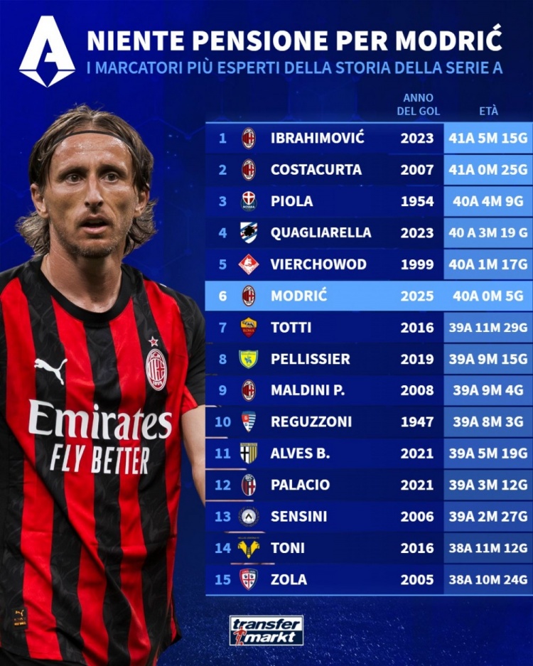 意甲年龄最大进球者排名:伊布、科斯塔库塔前两位,莫德里奇第六