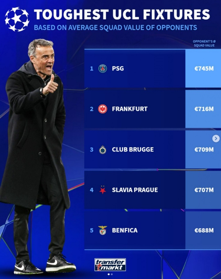 9月16日讯 本赛季欧冠即将打响,德转也根据联赛阶段对手平均身价盘点了各球队赛程难易程度,其中巴黎对手的平均身价最高,具体如下: