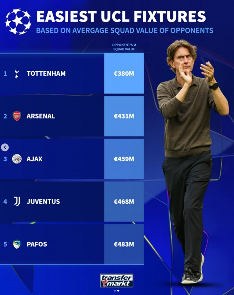 德转据对手平均身价列欧冠赛程难易程度:巴黎最困难,热刺最轻松
