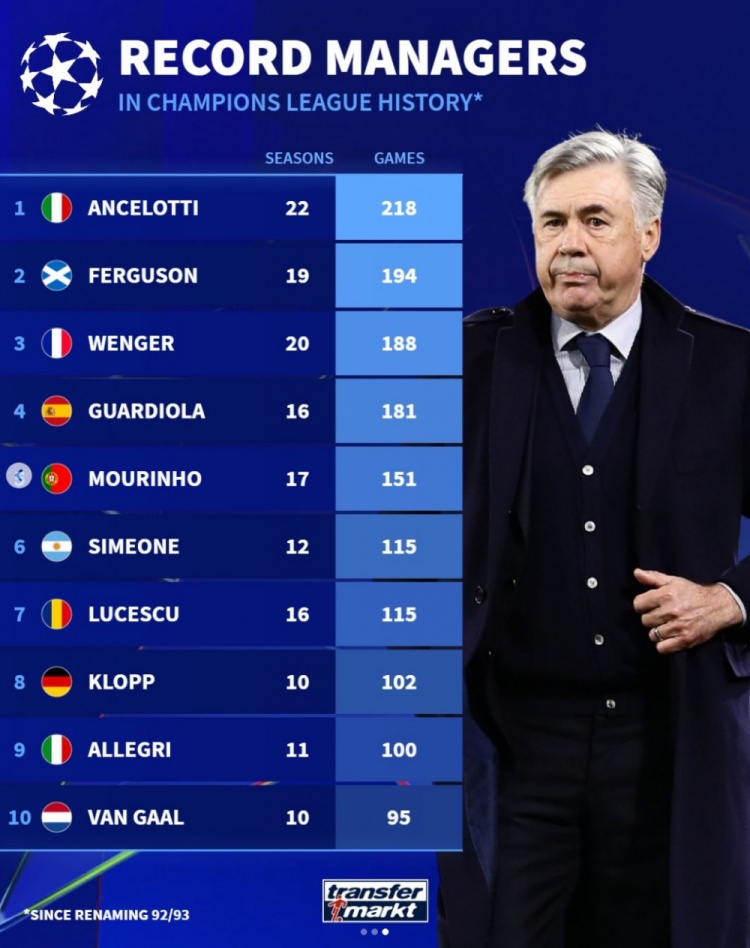 德转列欧冠执教场次排行:安切洛蒂218场居首,弗格森温格二三位
