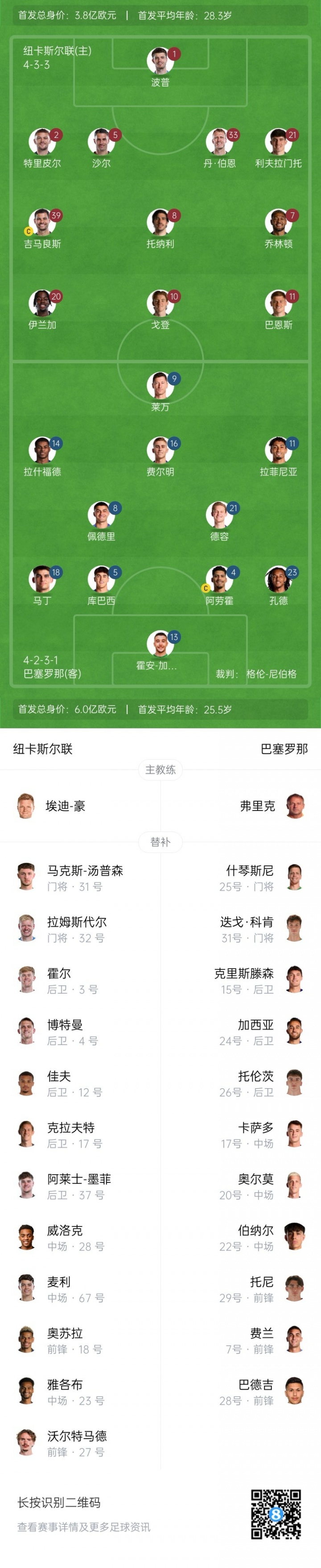 纽卡vs巴萨首发:莱万、阿劳霍、马丁先发,沃尔特马德替补
