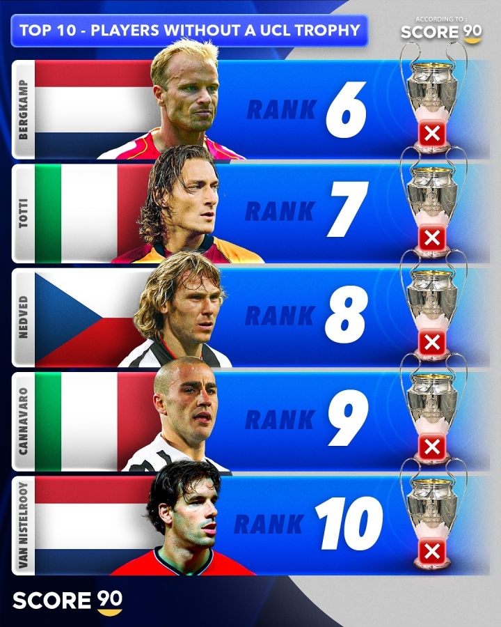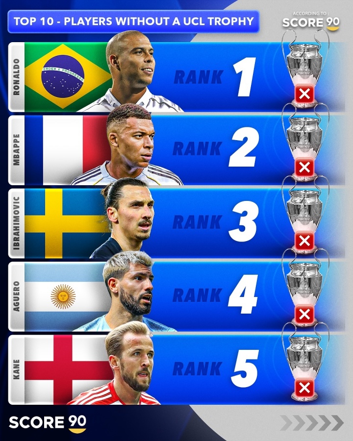 外媒Score90列无欧冠球员TOP10:1、罗纳尔多2、姆巴佩3、伊布4、阿圭罗5、凯恩6、博格坎普7、托蒂8、内德维德9、卡纳瓦罗10、范尼...