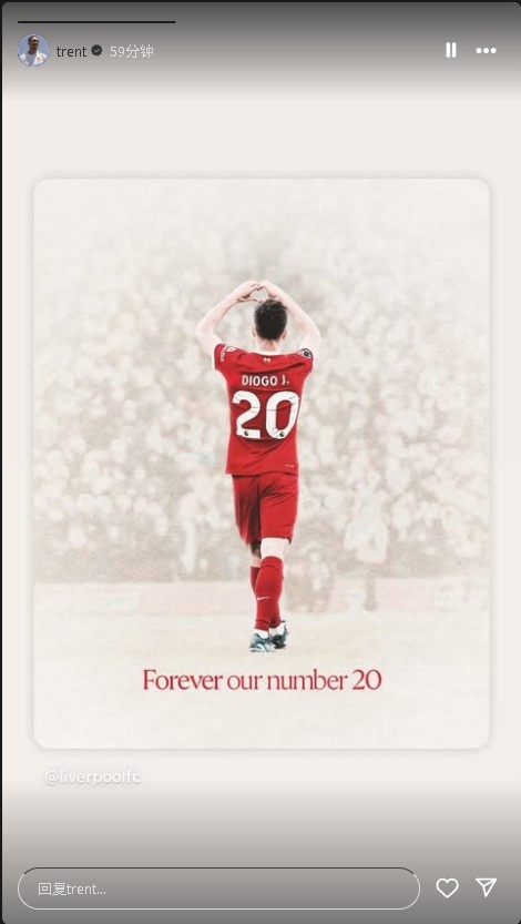 前利物浦球员阿诺德更新社媒,转发了利物浦缅怀若塔的社媒。