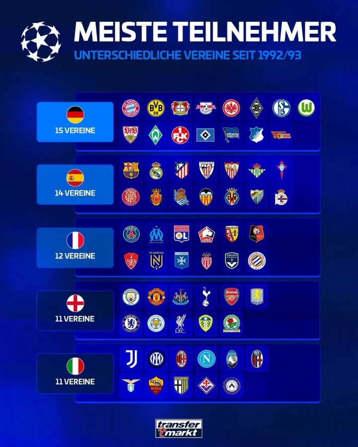 9月22日讯 德国转会市场统计了1992-93赛季欧冠改制以来,欧洲五大联赛参加欧冠正赛情况,德甲共15队出现在欧冠赛场最多,意甲11队最少。