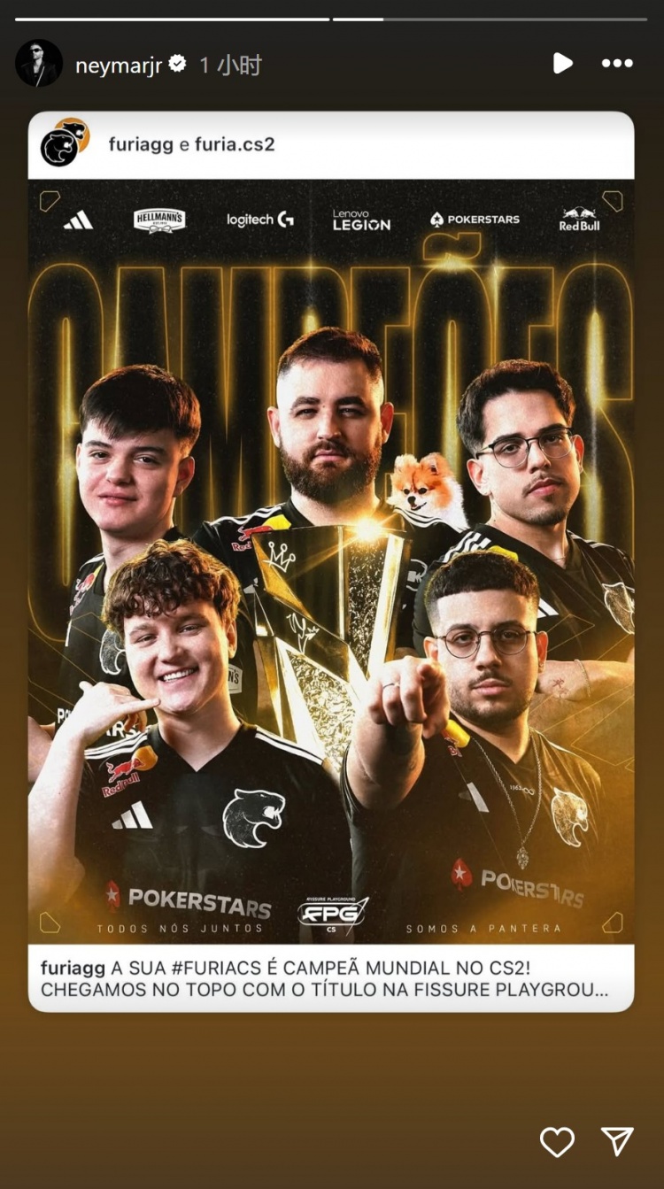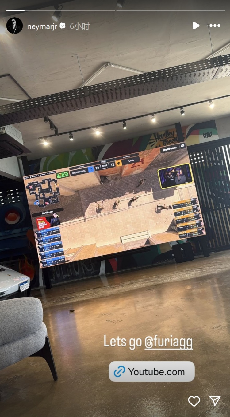 内马尔观看CS2裂变天地S2决赛直播,为巴西战队黑豹加油,他在社交媒体上晒出照片。